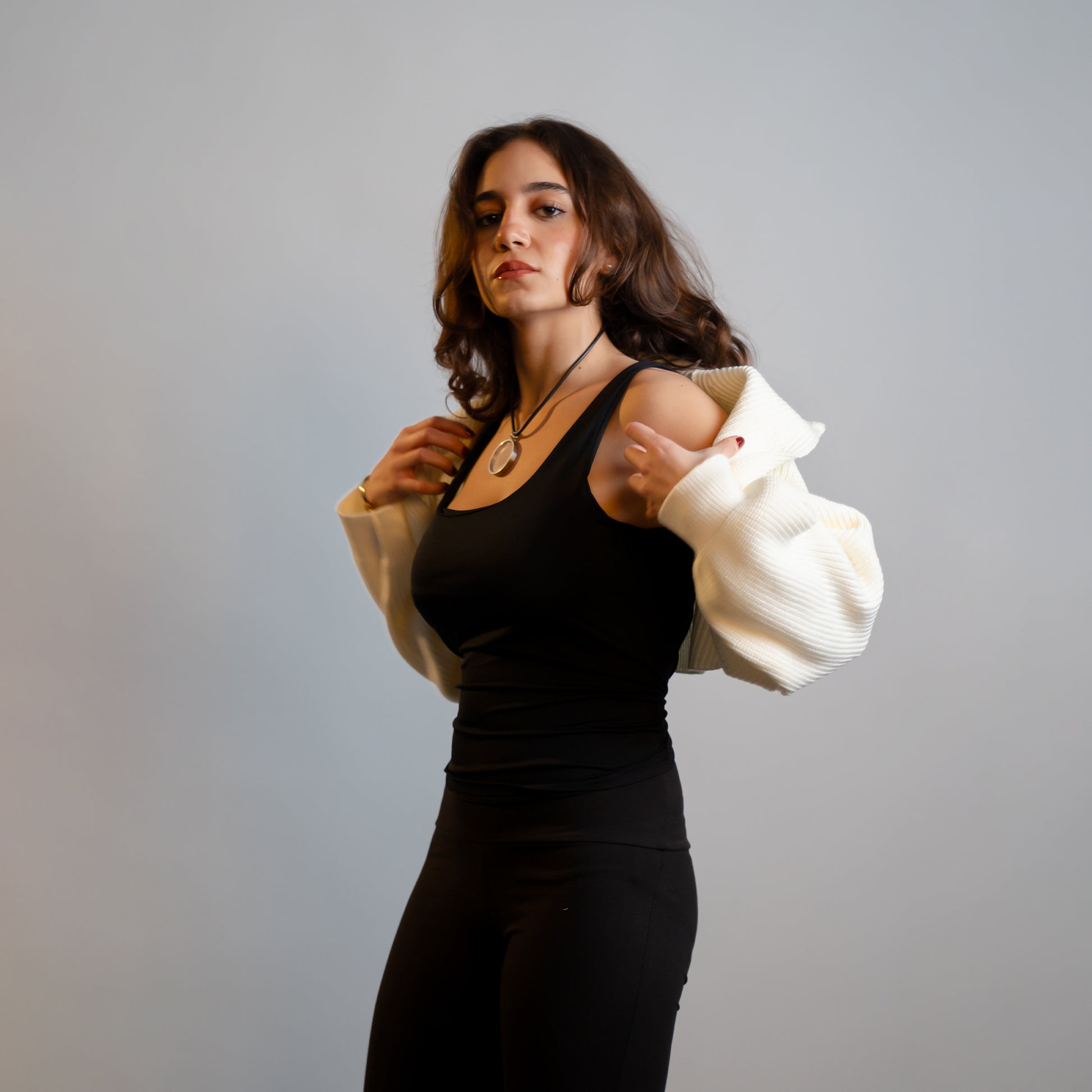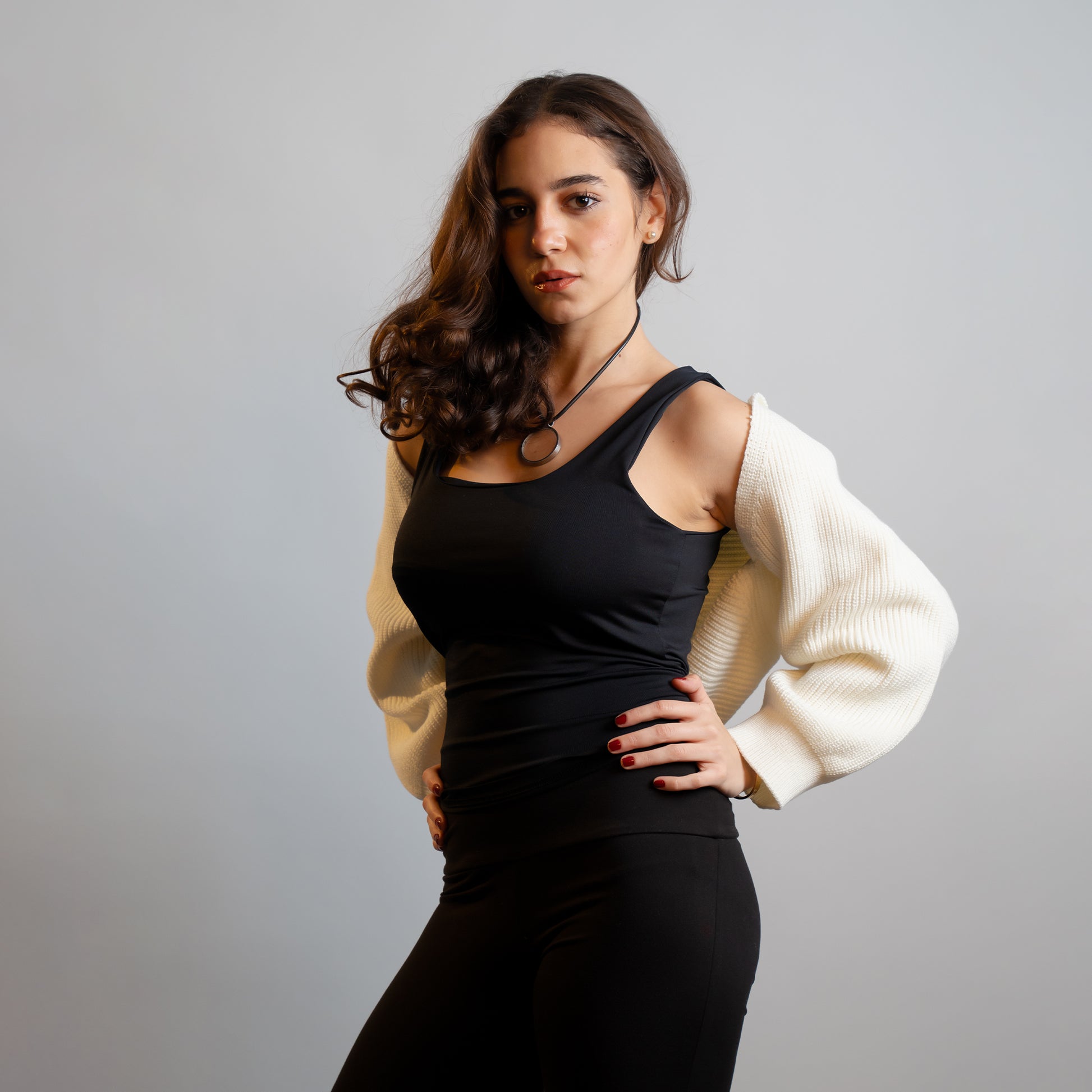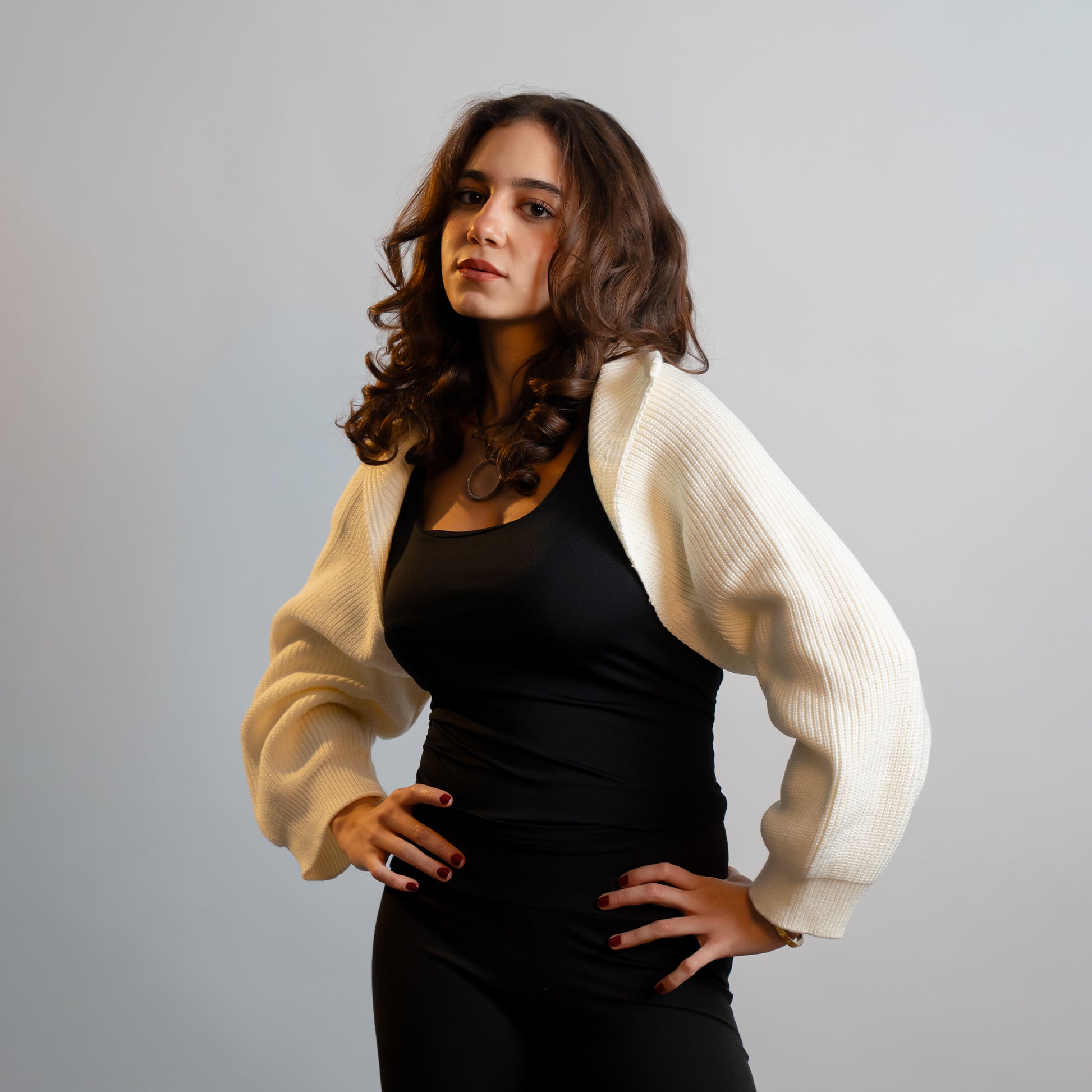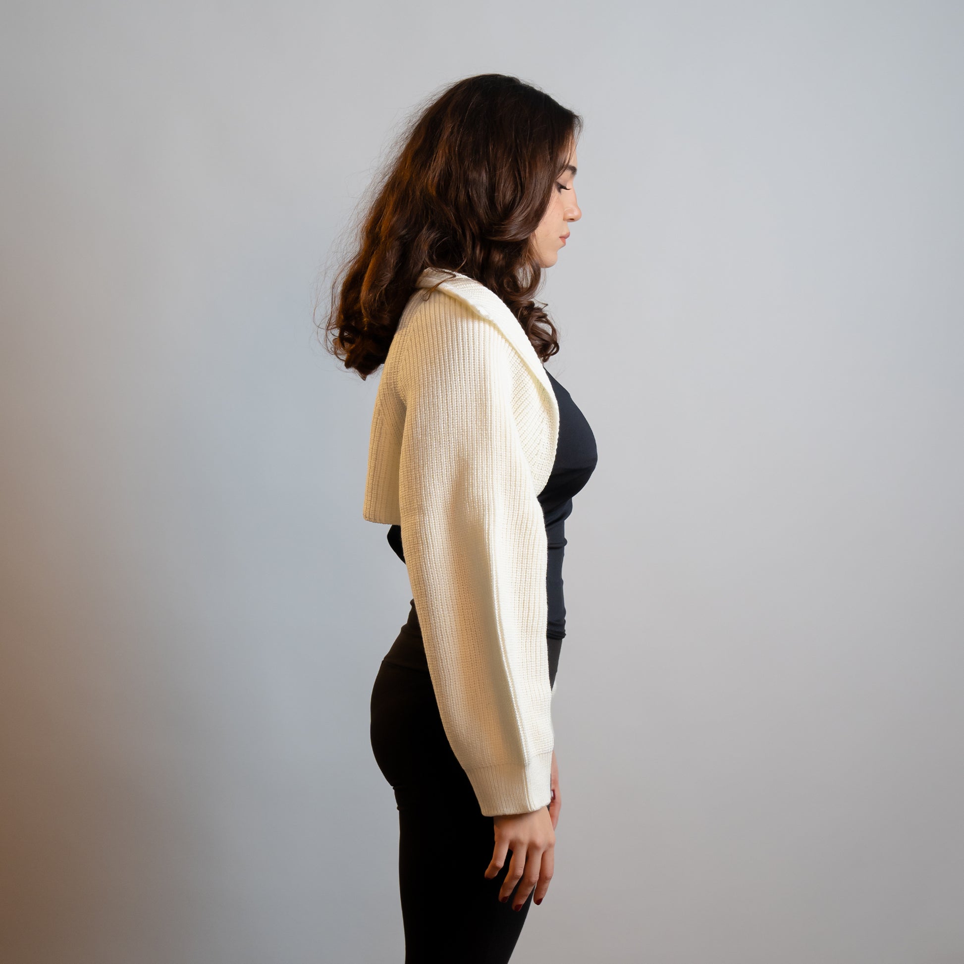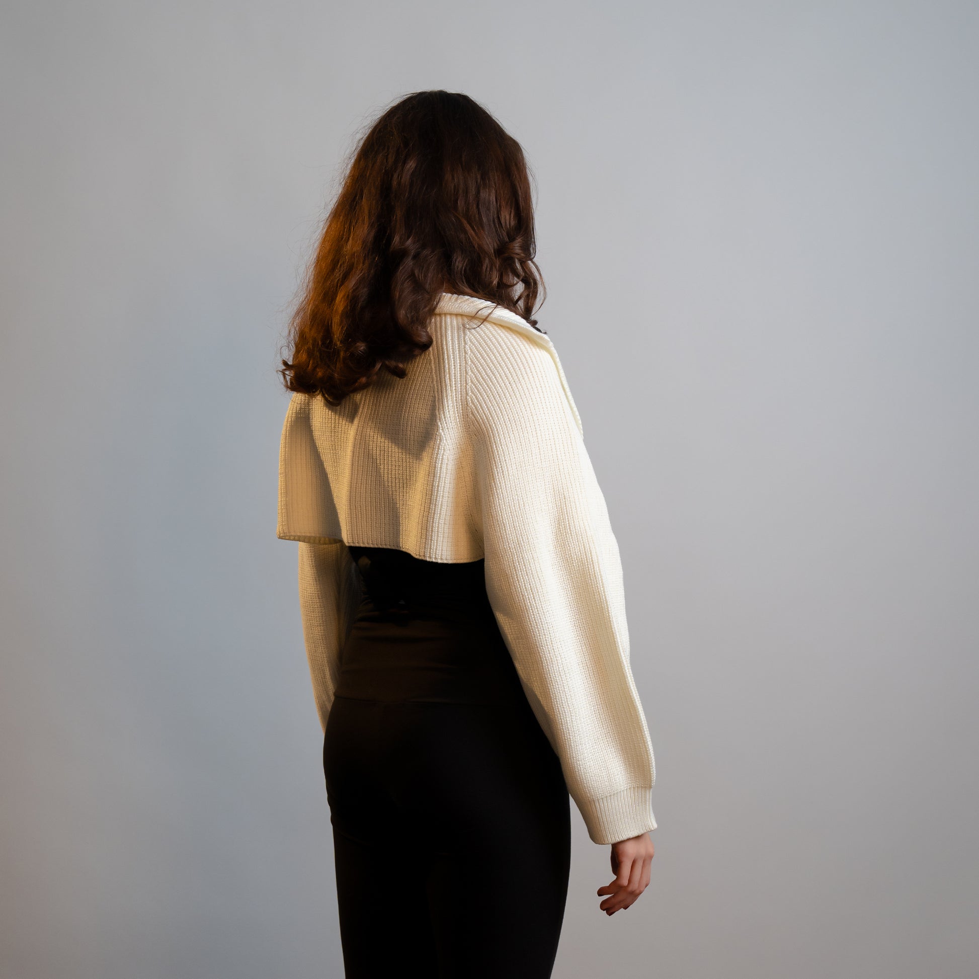 The CLOUD KNIT CROPPED CARDIGAN is a simple, boxy, slightly cropped cardigan with a focus on its special two-tone Egyptian Wool Yarn.