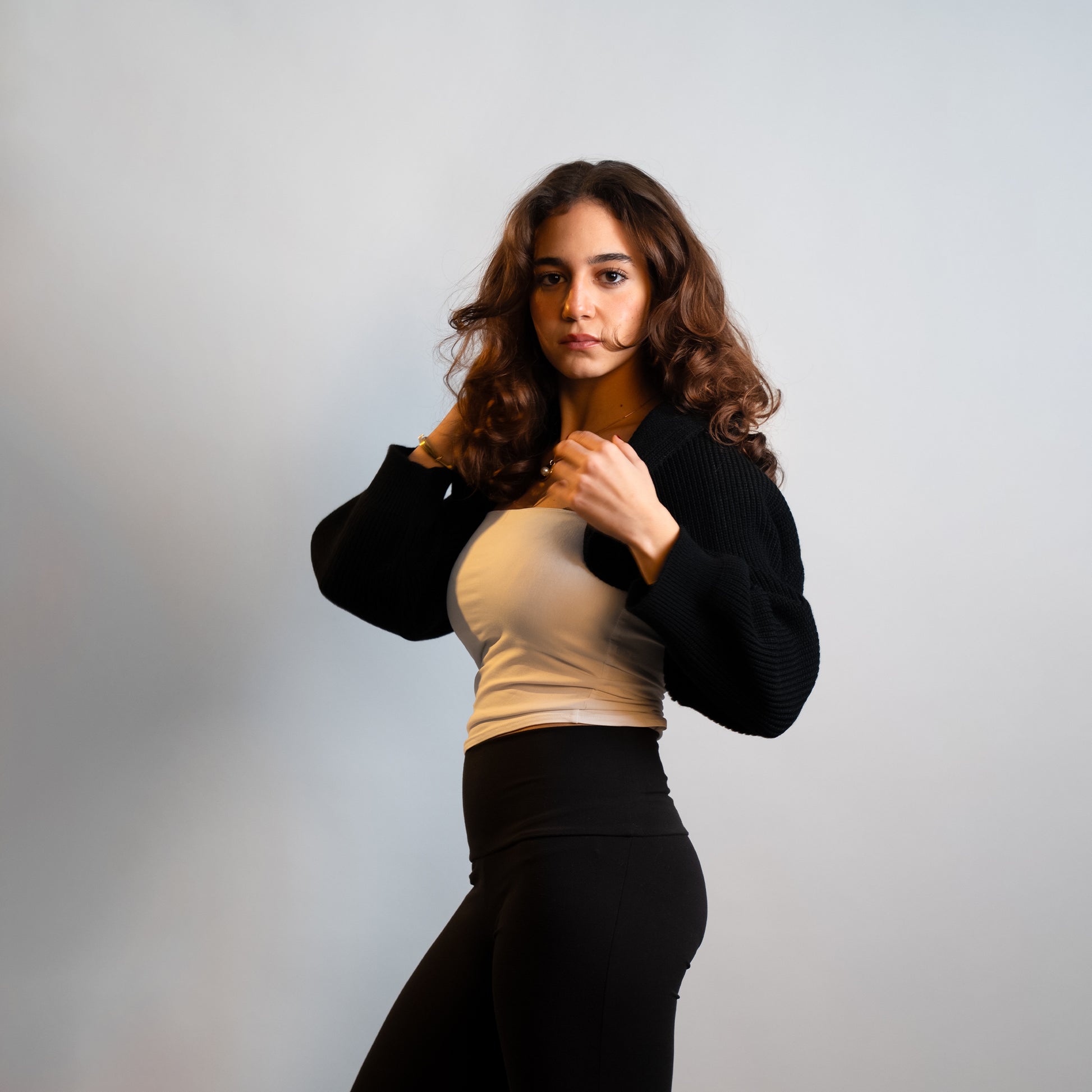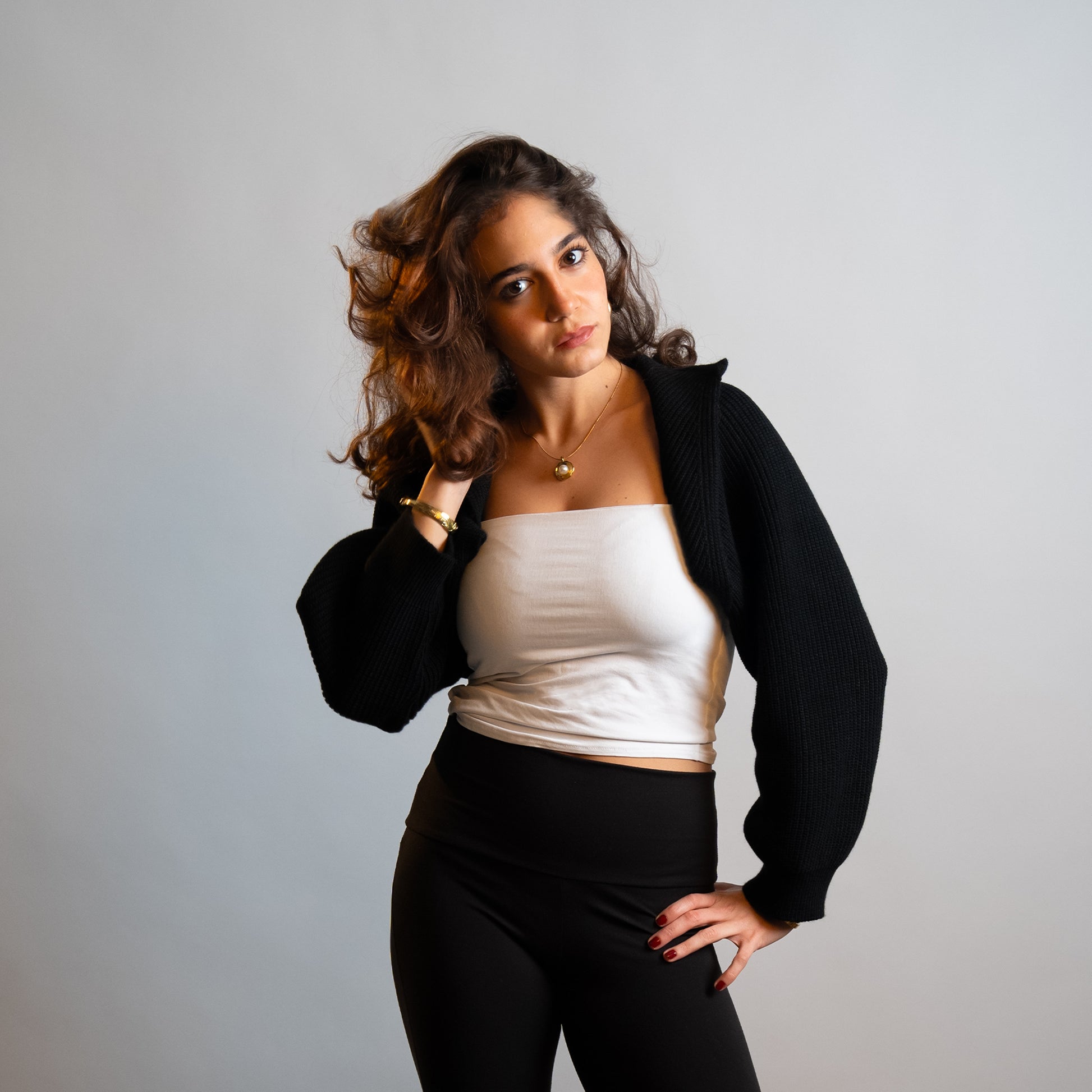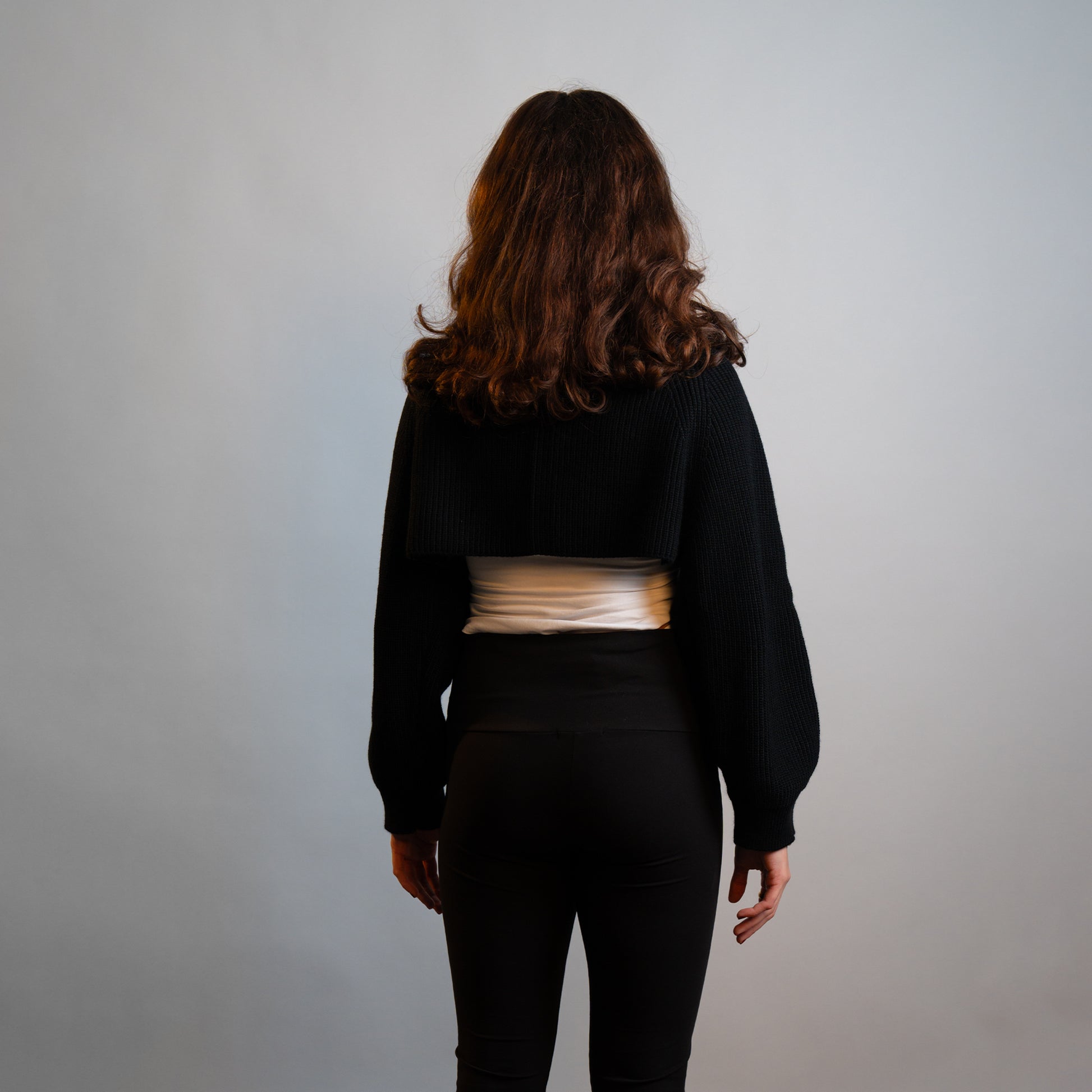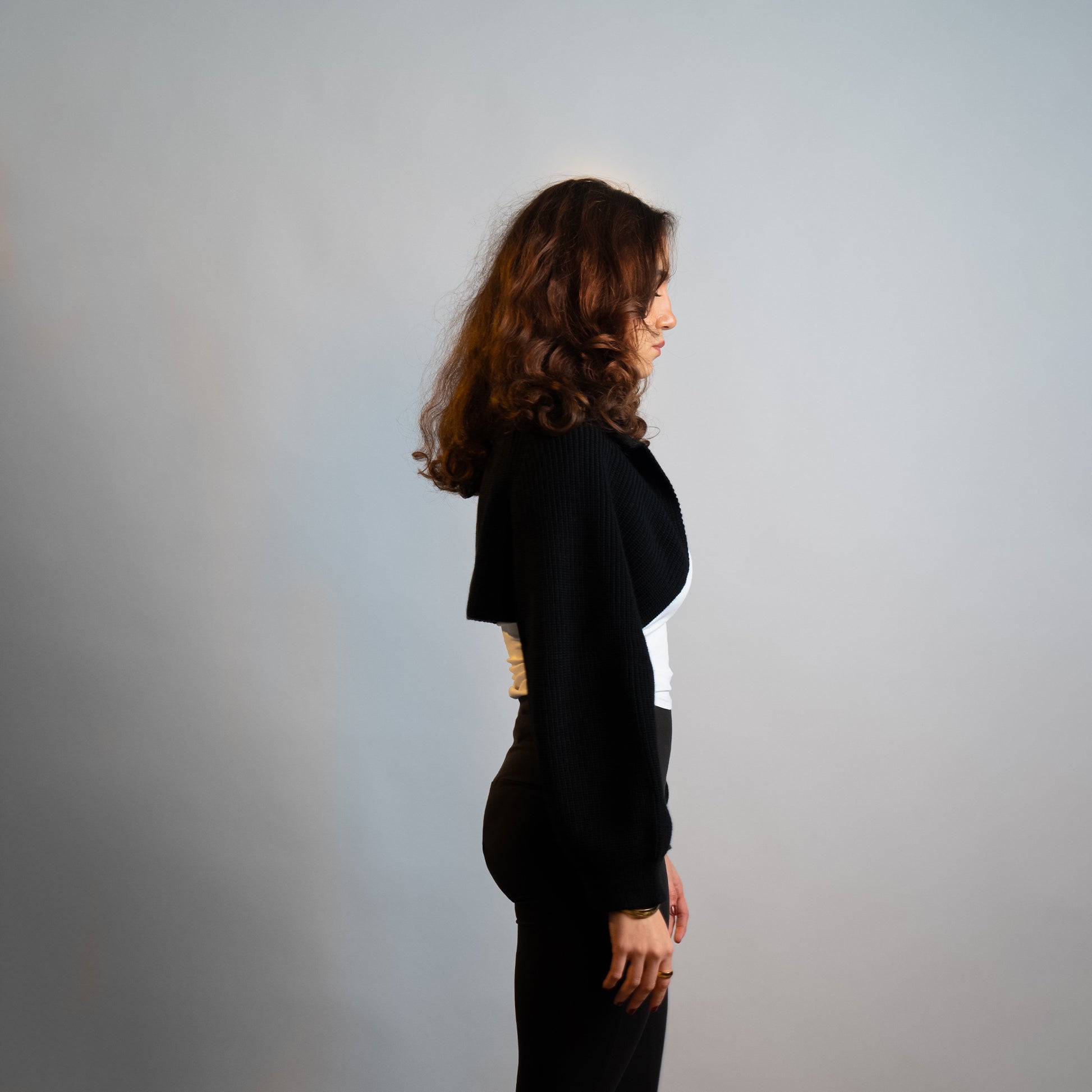 The NOIR KNIT CROPPED CARDIGAN is a simple, boxy, slightly cropped cardigan with a focus on its special two-tone Egyptian Wool Yarn.