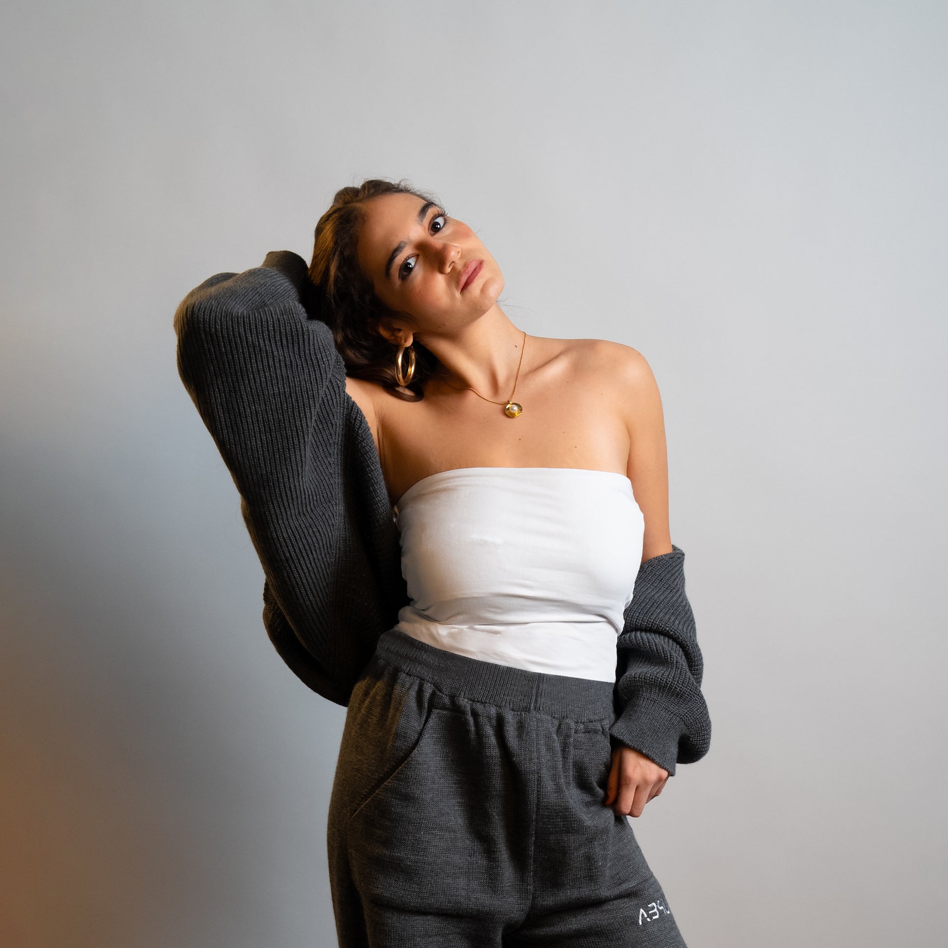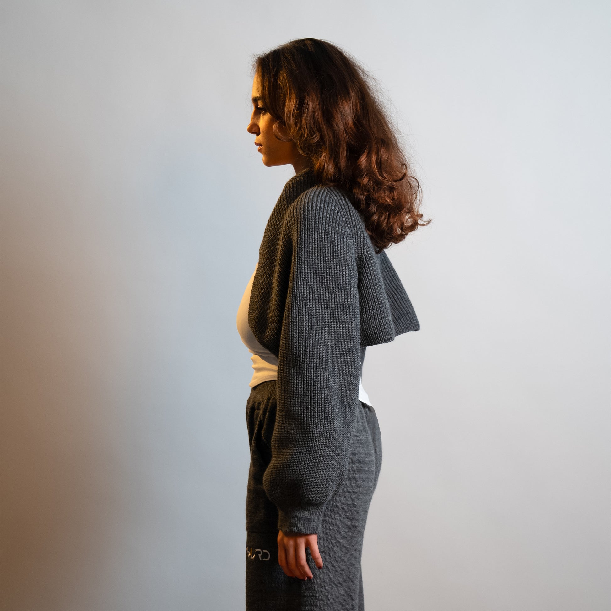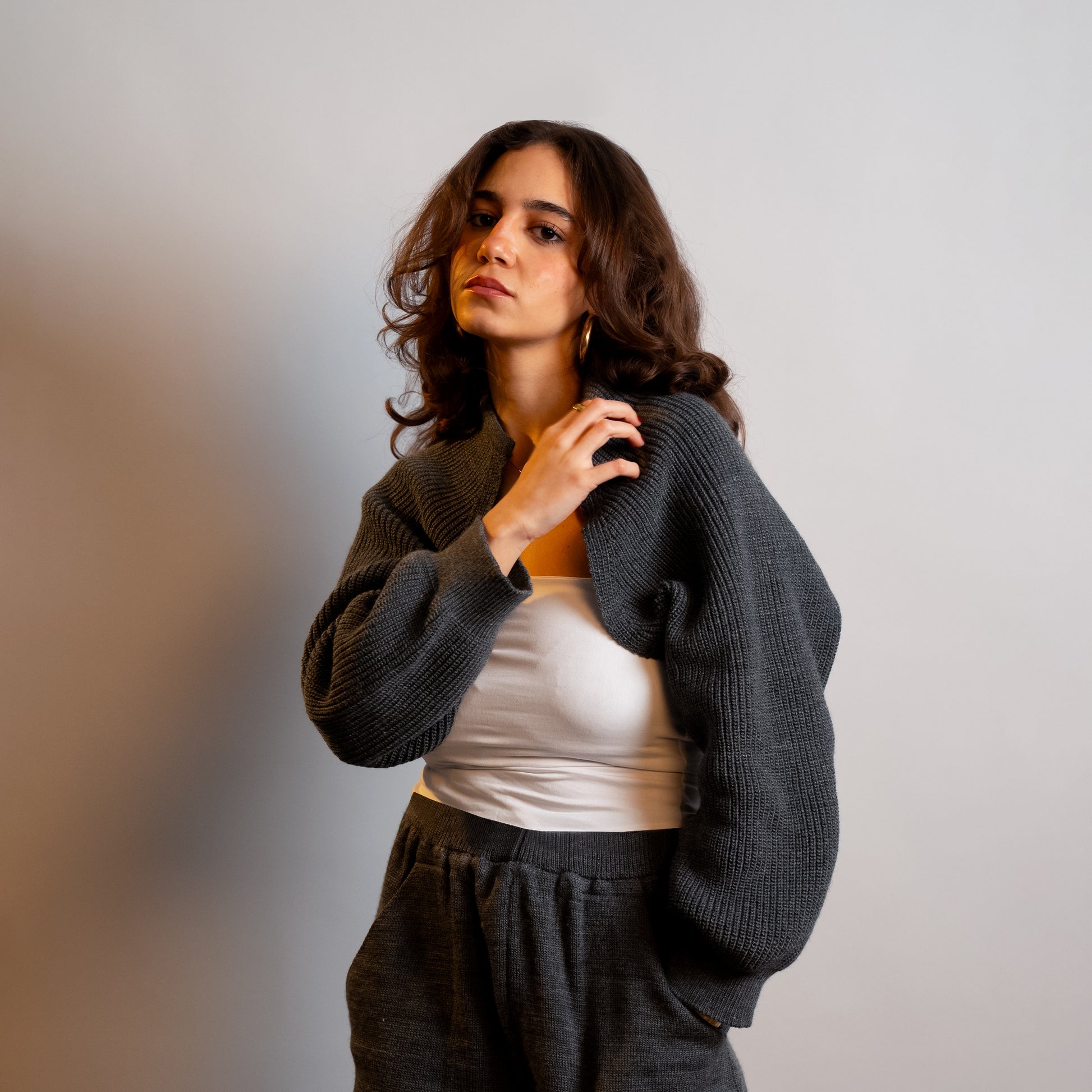 The STONE KNIT CROPPED CARDIGAN is a simple, boxy, slightly cropped cardigan with a focus on its special two-tone Egyptian Wool Yarn.